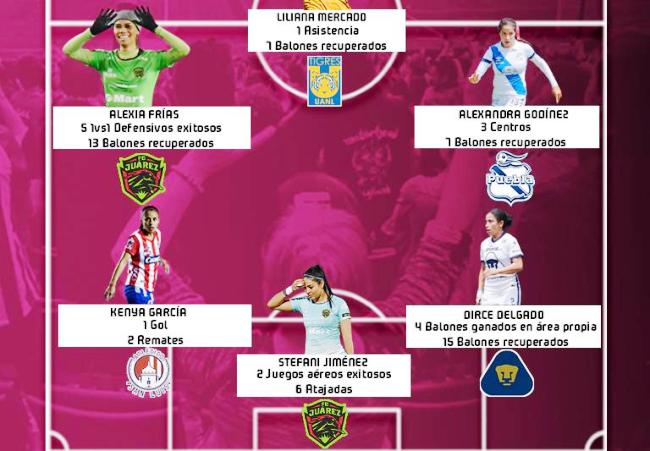 El once ideal se conformó de la siguiente manera: Stefani Jiménez (Juárez), Dirce Delgado (Pumas), Kenya García (San Luis), Alexia Frías (Juárez), Alexandra Godínez (Puebla).