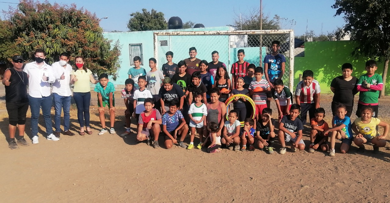La maestra Tey Gutiérrez, presidenta de la Asociación Pensamientos que Trascienden (PENTRA), colaboró con material deportivo a jóvenes que entrenan en el campo de futbol de la colonia Buenavista.