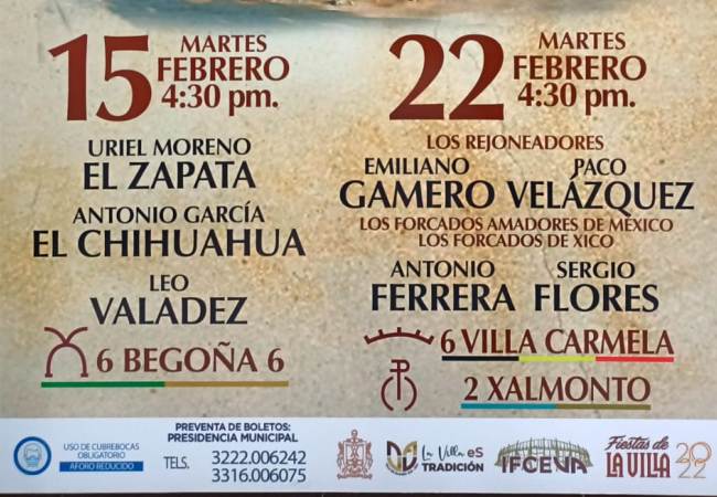 Los carteles son los siguientes: el martes 15 de febrero se presentan, Uriel Moreno «El Zapata», Antonio Garcia «El Chihuahua» y Leo Valadez con 6 toros de Begoña.