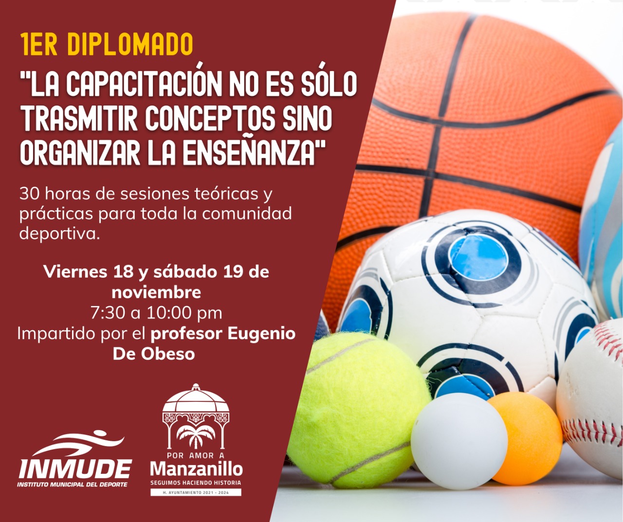 Con el objetivo de mostrar conceptos teóricos y prácticos para una enseñanza deportiva eficaz, el Ayuntamiento de Manzanillo a través del Instituto Municipal del Deporte (INMUDE), convoca a la comunidad de las diversas disciplinas al primer diplomado, “La capacitación no es sólo trasmitir conceptos sino organizar la enseñanza”, mismo que será impartido por el profesor Eugenio De Obeso.