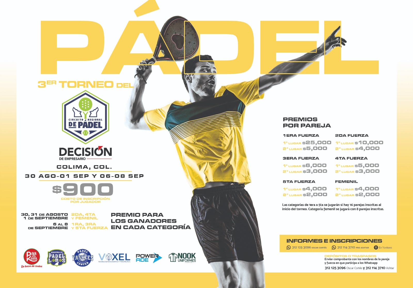 Los interesados en participar en la Tercer Edición del Circuito Regional de Pádel, se pueden comunicar a los teléfonos 312 125 3096 y al 312 114 3710 .