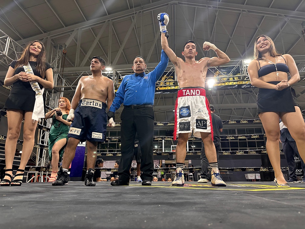 El colimense Tano Brambila consiguió su cuarta victoria como profesional y es la primera que obtiene por la vía del KO, en la categoría superpluma, en esta ocasión se impuso al debutante tapatío, Édgar Orozco.