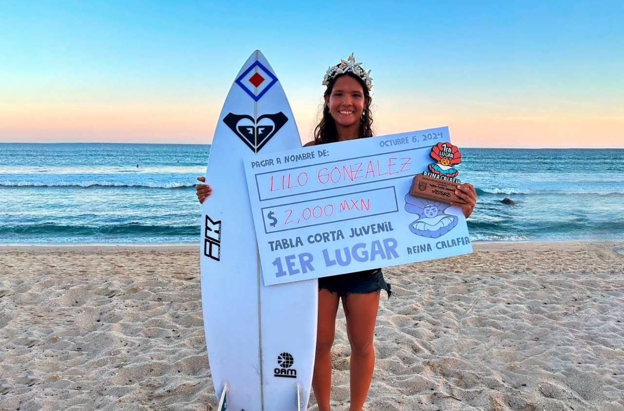 La surfista colimense Ana Lyllia González, mejor conocida como ‘Lilo’, se coronó campeona en la categoría Sub-18 del primer torneo de surf Reina Calafia, celebrado del 4 al 6 de octubre de 2024 en Playa La Fortuna, en Cabo del Este, Baja California Sur.