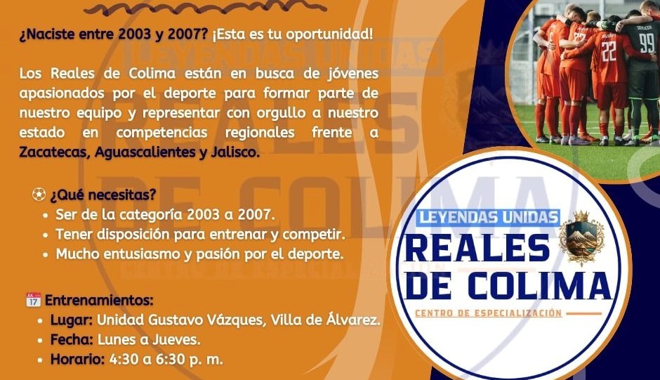 Pero, ¿qué ocupas para integrarte al equipo? Solo ser nacido entre 2003 y 2007, talento, disciplina y ganas de brillar sobre el terreno de juego, ven y únete a Reales de Colima y representa al estado con orgullo, señala el presidente del equipo.