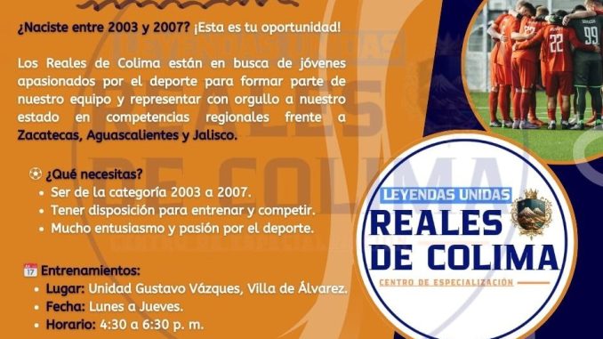 Los Reales de Colima, equipo con una excelencia deportiva y trabajo profesional, están en busca de jóvenes apasionados por el deporte para formar parte del equipo de Futbol y así, representar al estado en competencias regionales frente a escuadras de Zacatecas, Aguascalientes, Jalisco y Colima, informó el presidente del conjunto, Mauricio Montes.