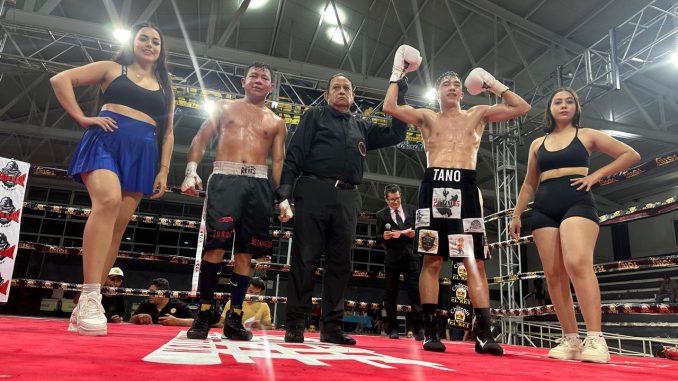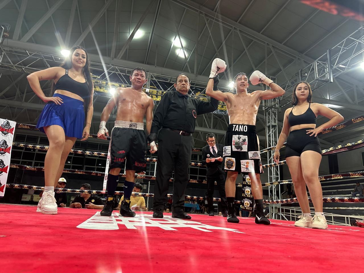 En superpluma, Tano Brambila (9-0) mantuvo el invicto y le ganó por abandono en el sexto round a Ezequiel Betancourt de Ciudad del Carmen Campeche quien ya no quiso más castigo del púgil local.